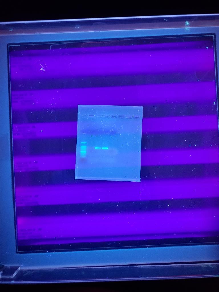 Our first step in the process was making an Agrose gel. We then poured in a TAE buffer. After mixing our DR-0172 with a blue tracking dye, the gel electrophoresis is ready to separate the DNA, RNA and proteins. The experiment was successful as you can see from the band being illuminated under a uv light.